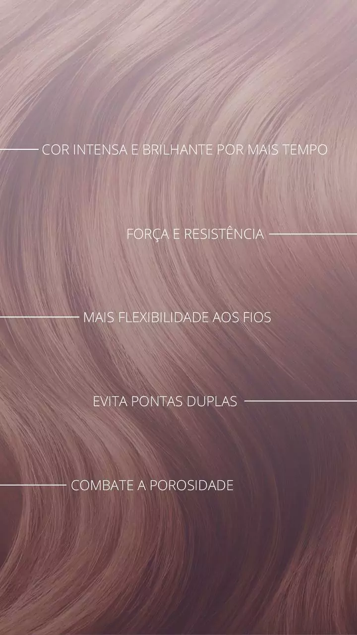 Cabelos protegidos, com cor duradoura, sem pontas duplas, mais fortes, resistentes e flexíveis.