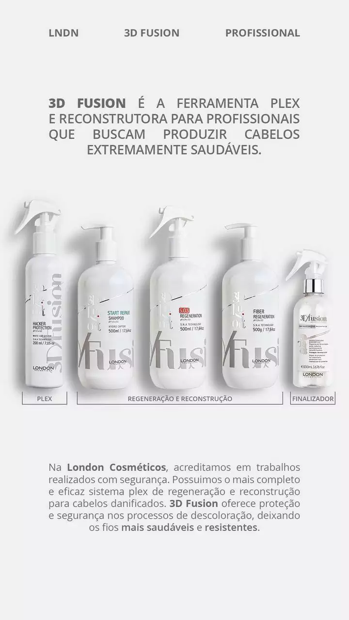 3D FUSION é uma linha Premium desenvolvida especificamente para atuar nos processos de descoloração. Com inovadora tecnologia (S.N.A TECHNOLOGY), a 3D FUSION possibilita proteger e reconstruir a fibra capilar antes, durante e após os serviços de descoloração, atuando com eficiência mesmo em cabelos extremamente sensibilizados. Visando a necessidade específica de cada caso, os produtos da linha foram desenvolvidos individualmente dentro das suas particularidades, porém, com total conectividade entre si. 3D FUSION é uma linha indispensável ao profissional cabeleireiro que prioriza resultados com segurança e cabelos saudáveis.