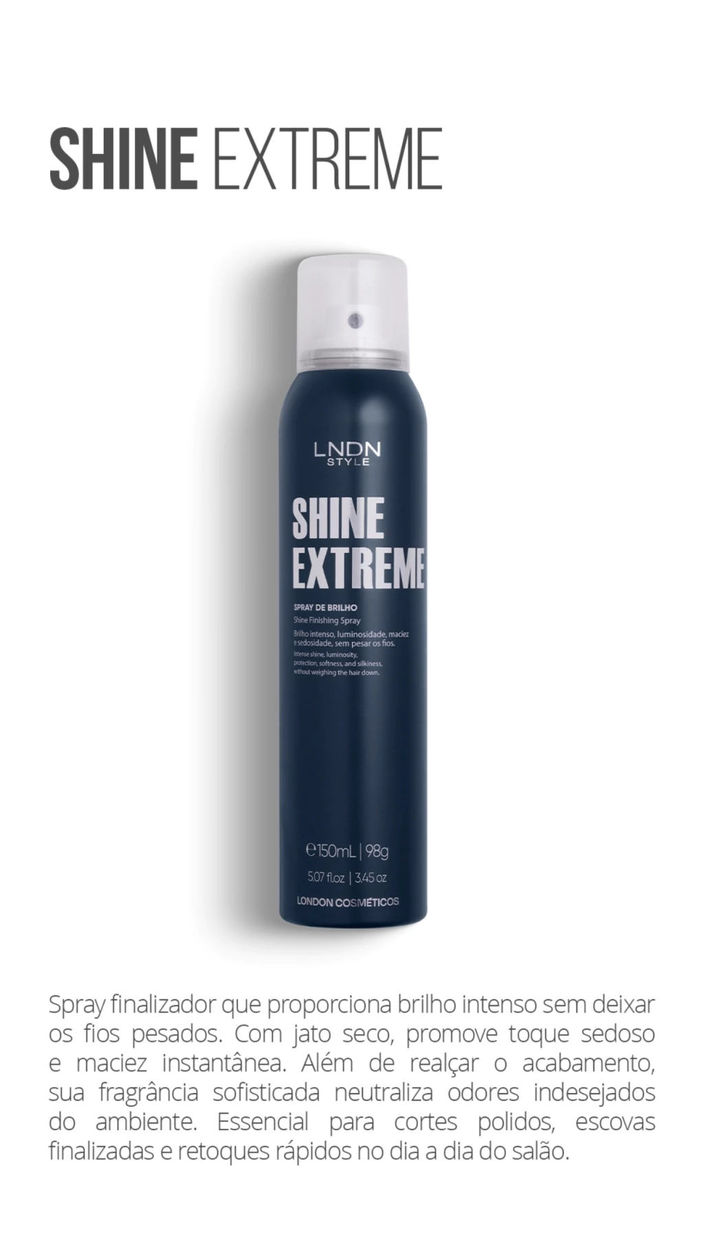 Spray finalizador que proporciona brilho intenso sem deixar os fios pesados. Com jato seco, promove toque sedoso e maciez instantânea. Além de realçar o acabamento, sua fragrância sofisticada neutraliza odores indesejados do ambiente. Essencial para cortes polidos, escovas finalizadas e retoques rápidos no dia a dia do salão.
