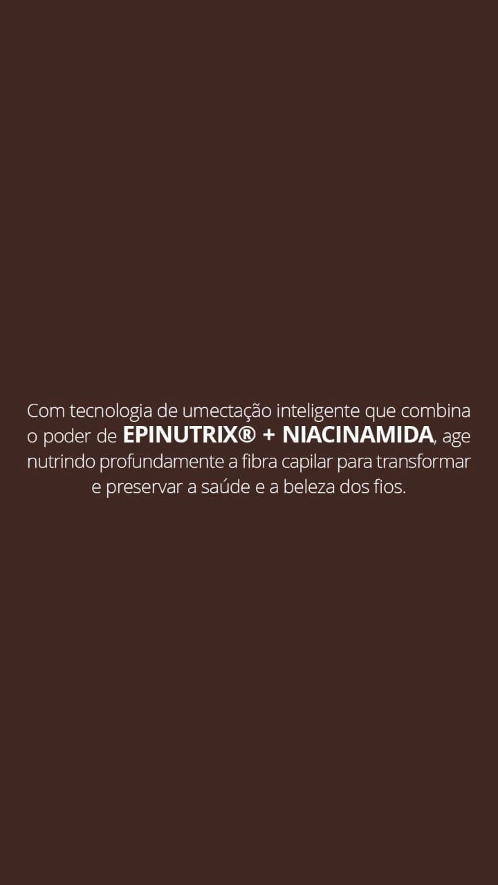 Com tecnologia de umectação inteligente que combina o poder de EPINUTRIX®️ + NIACINAMIDA, age nutrindo profundamente a fibra capilar para transformar e preservar a saúde e a beleza dos fios.